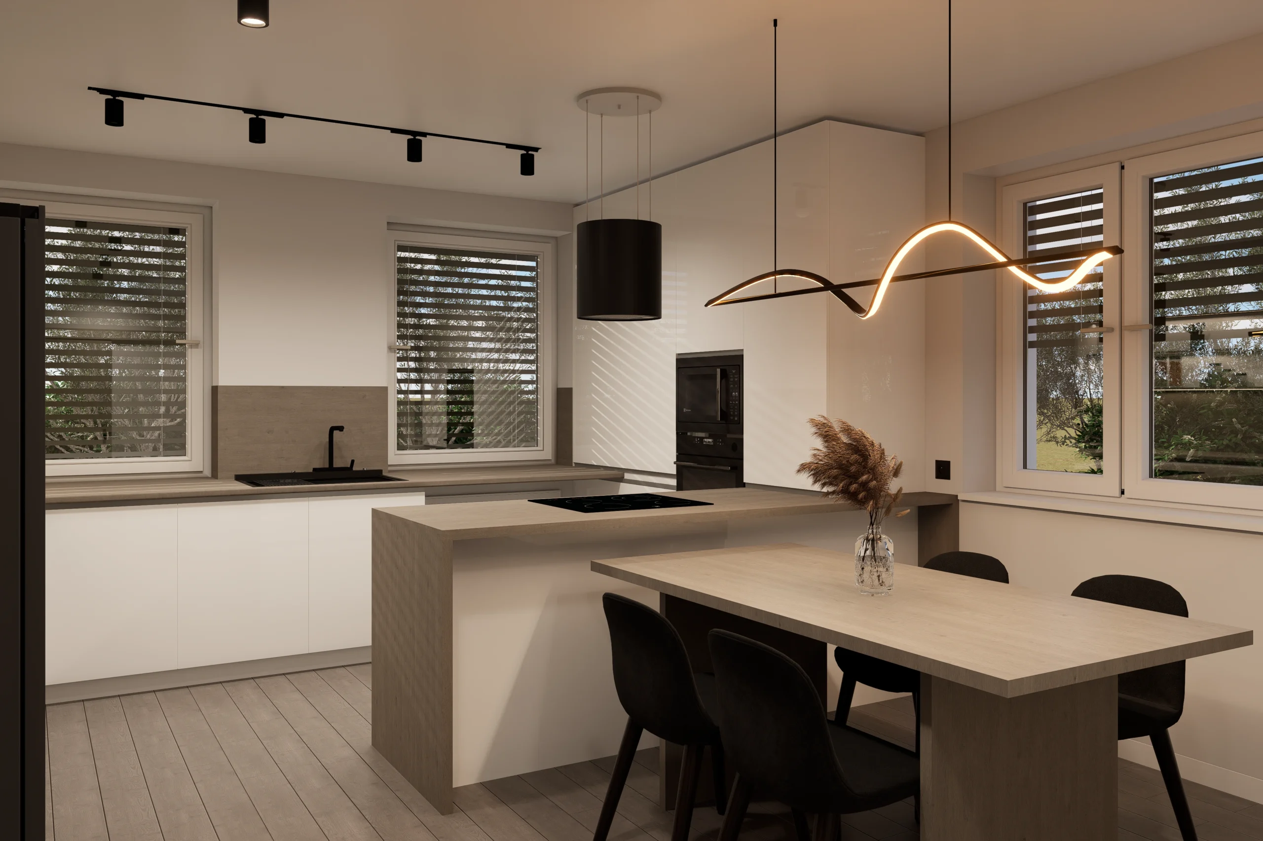 Koncept stavia na materiálovej úprimnosti, kde svetlé drevo v kombinácii s kamennými prvkami a čiernymi akcentmi vytvára stabilné a esteticky podnetné prostredie.