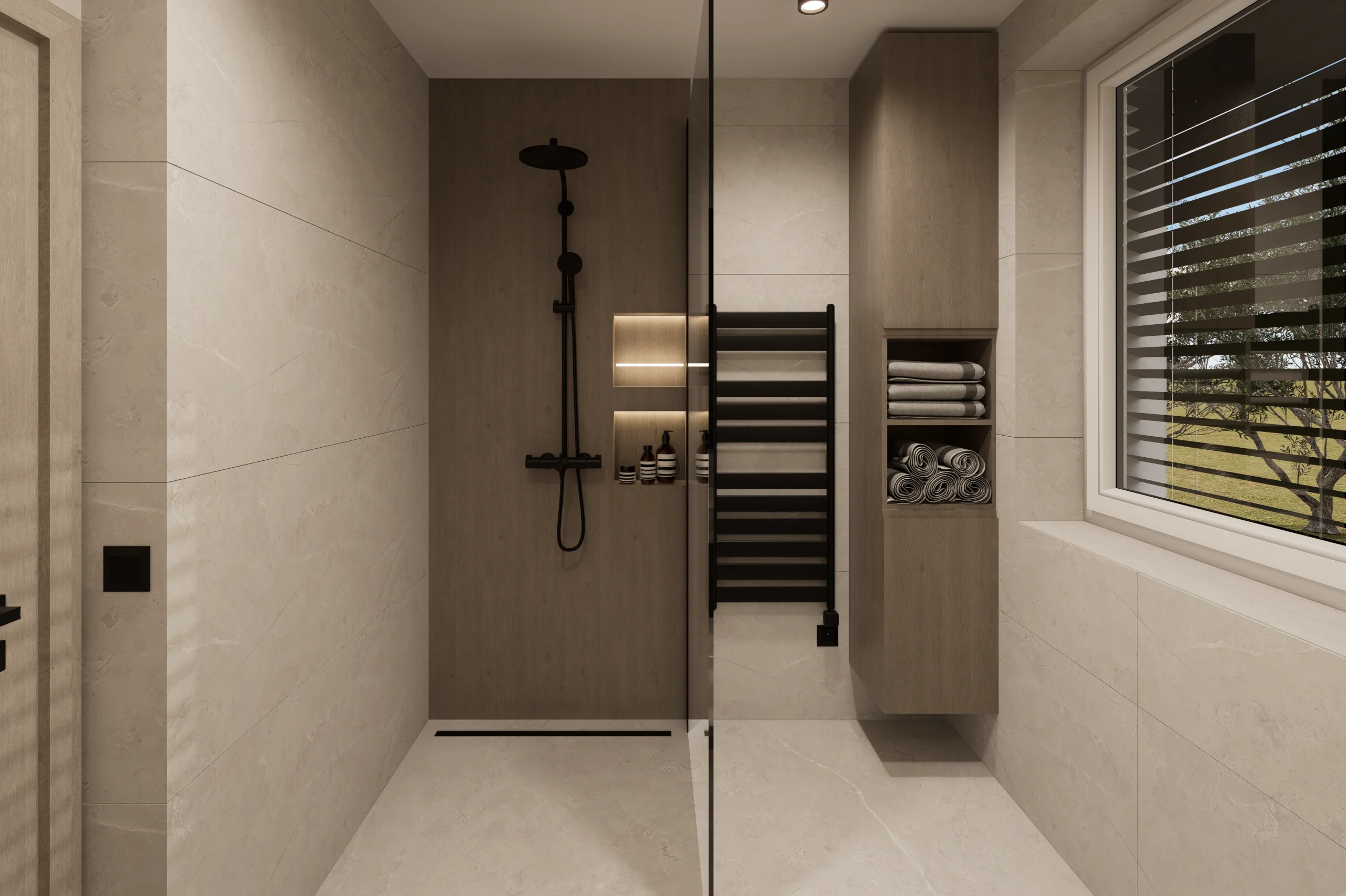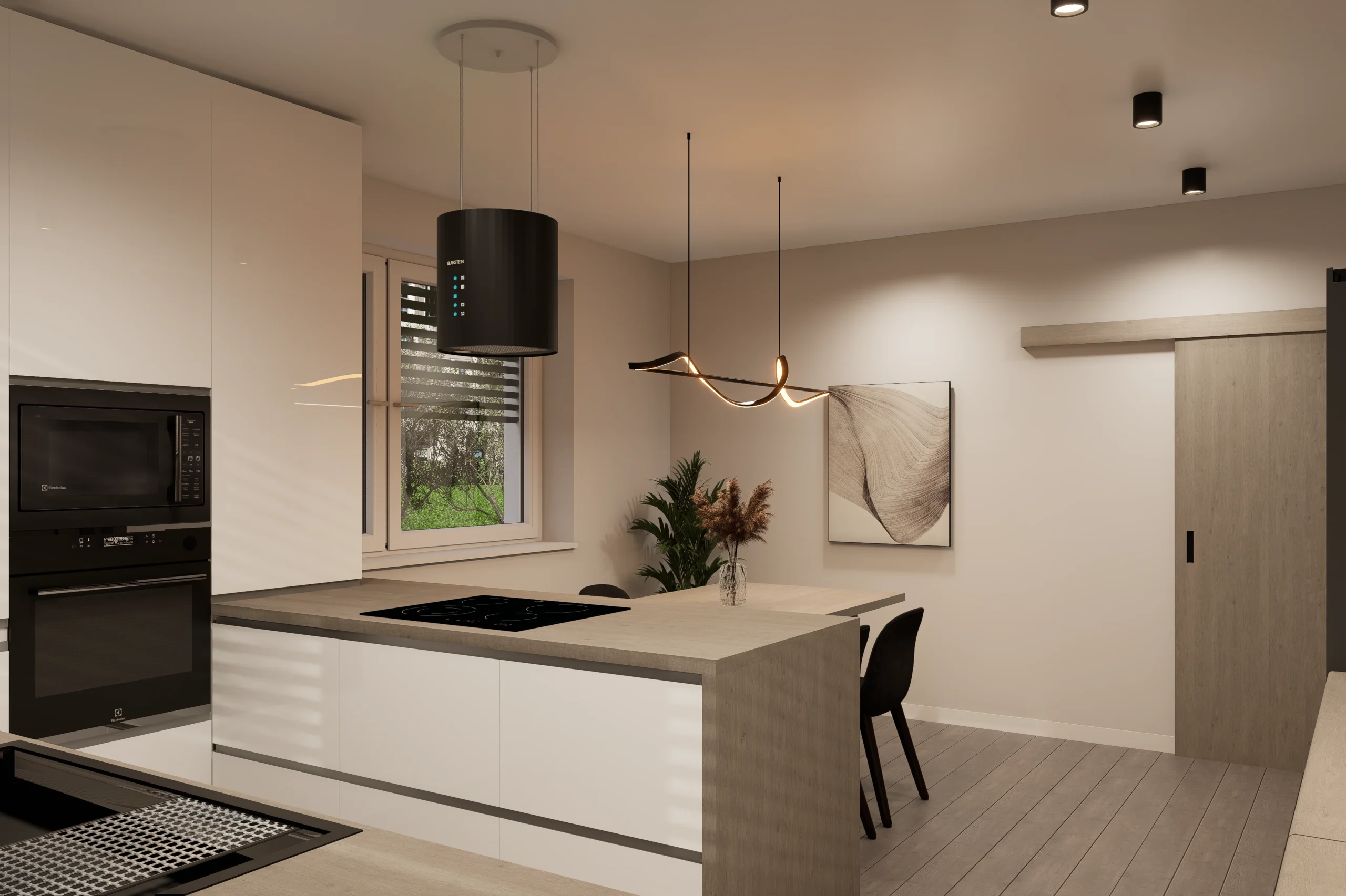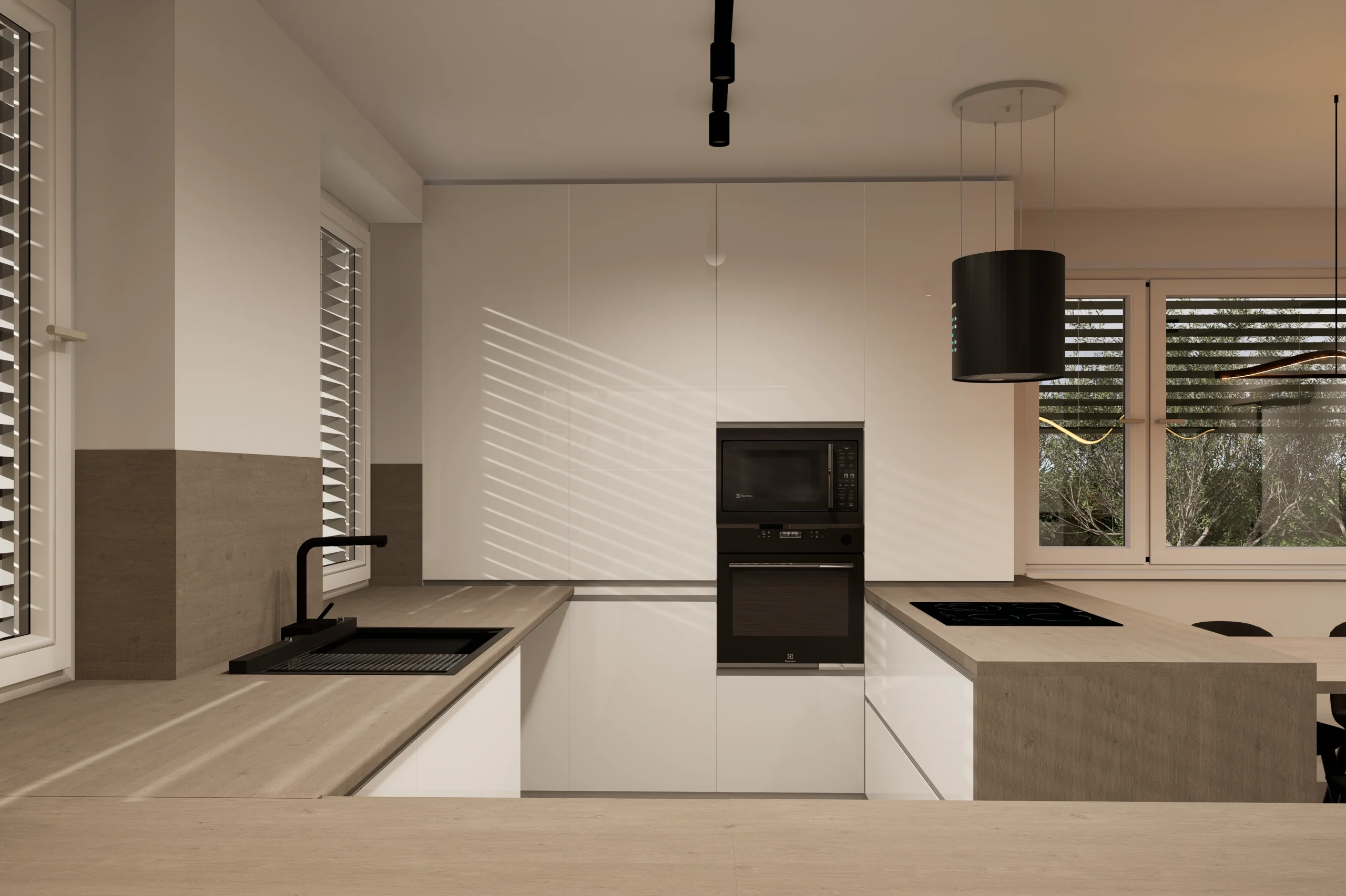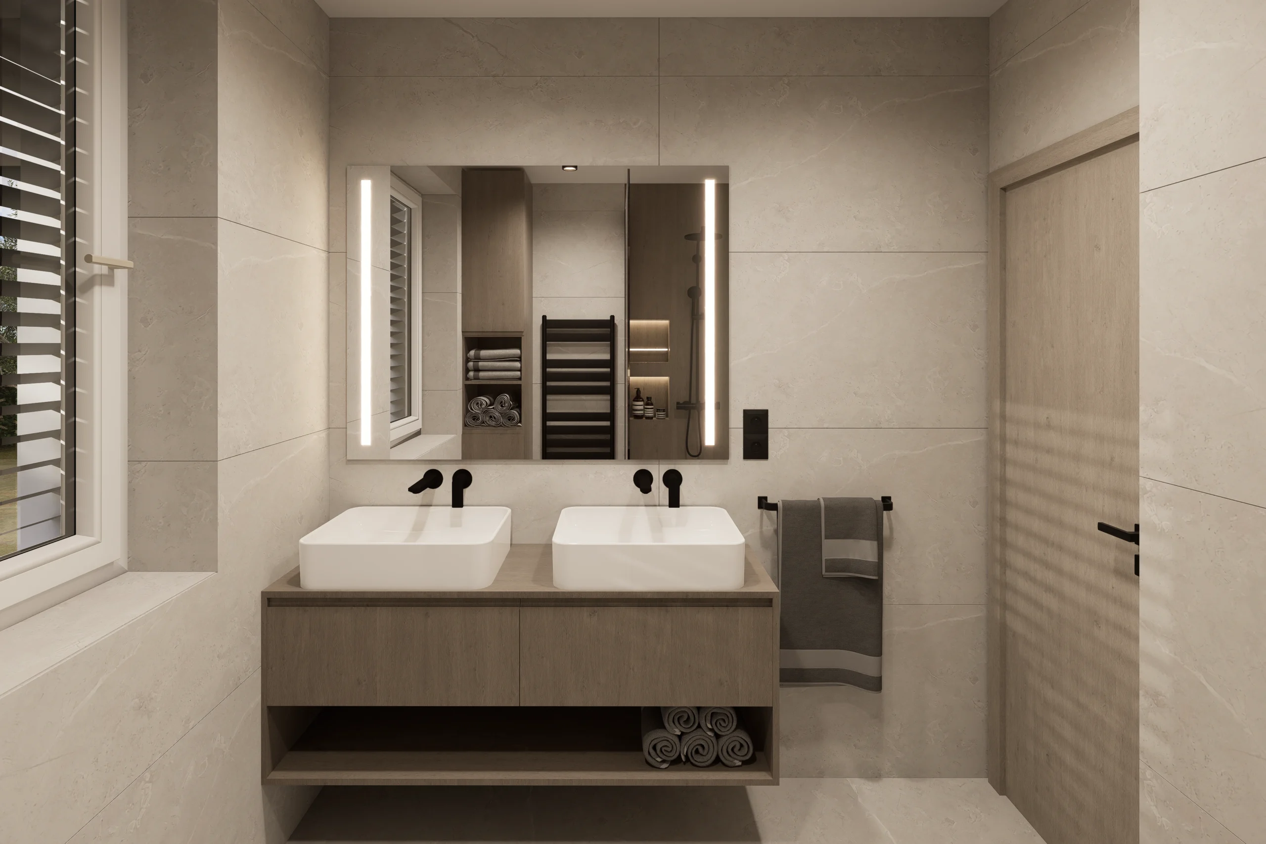 Tento interiérový návrh je hľadaním dokonalej rovnováhy medzi vizuálnym tichom a hrejivým materiálovým detailom. Architektúra priestoru cielene využíva limitovanú, no o to silnejšiu paletu textúr, kde hlavné slovo dostáva prirodzené svetlo a jeho interakcia s čistými horizontálnymi líniami.