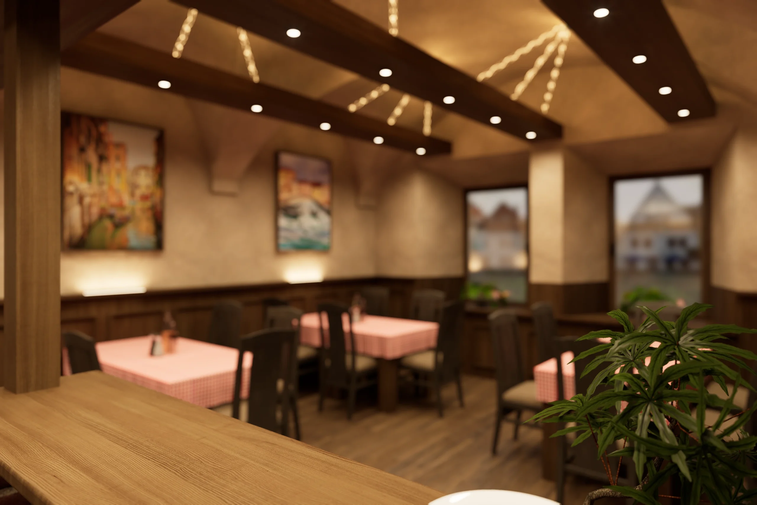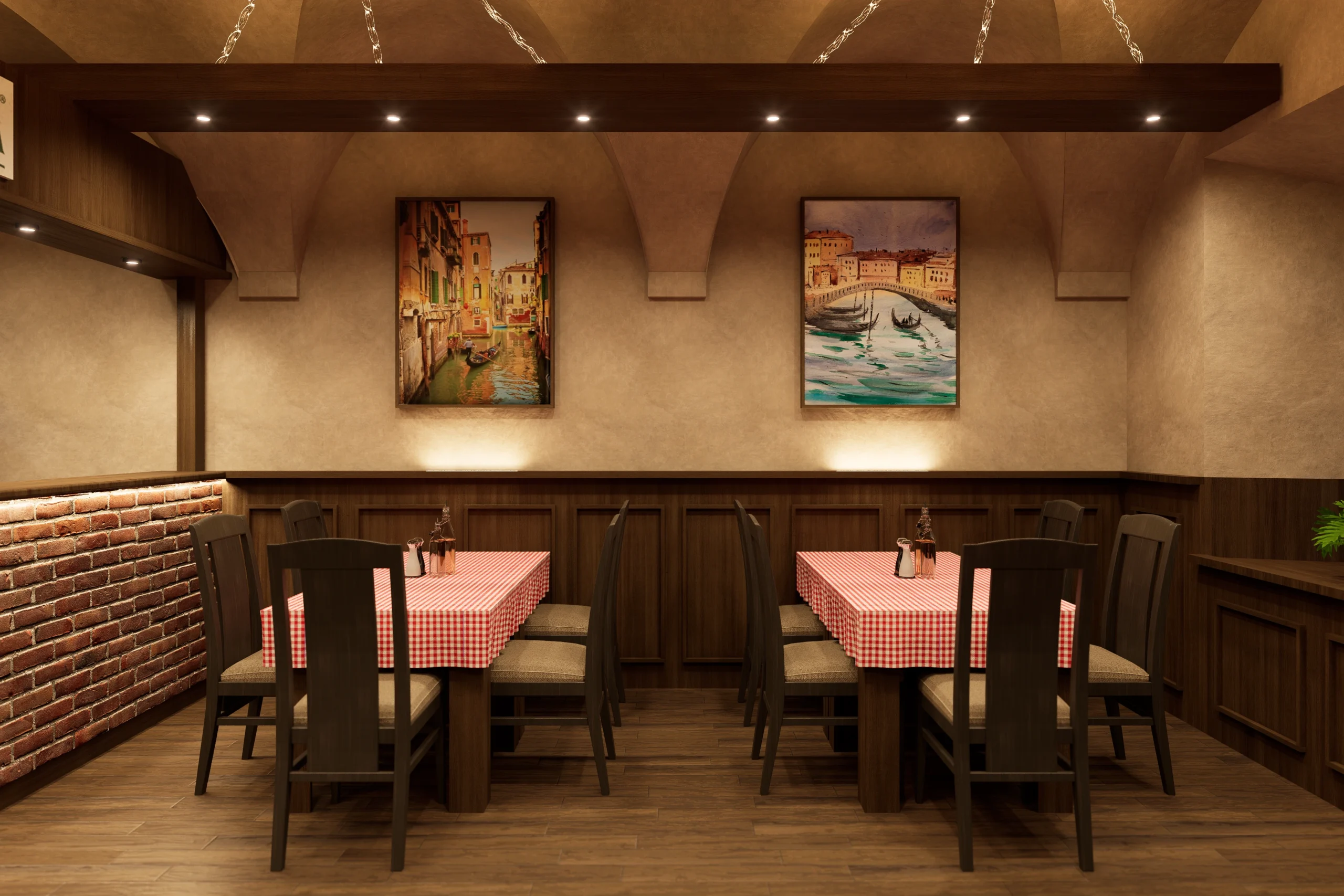 Interiér definujú hlboké textúry dreva, tehlový obklad baru s integrovaným podsvietením a klenby, ktoré definujú rytmus priestoru. Umelecké diela na stenách a premyslené detaily v podobe tradičného stolovania podčiarkujú taliansky temperament projektu. Svetlo v tomto návrhu neplní len funkčnú úlohu, ale modeluje atmosféru rodinnej pohody a pokoja.